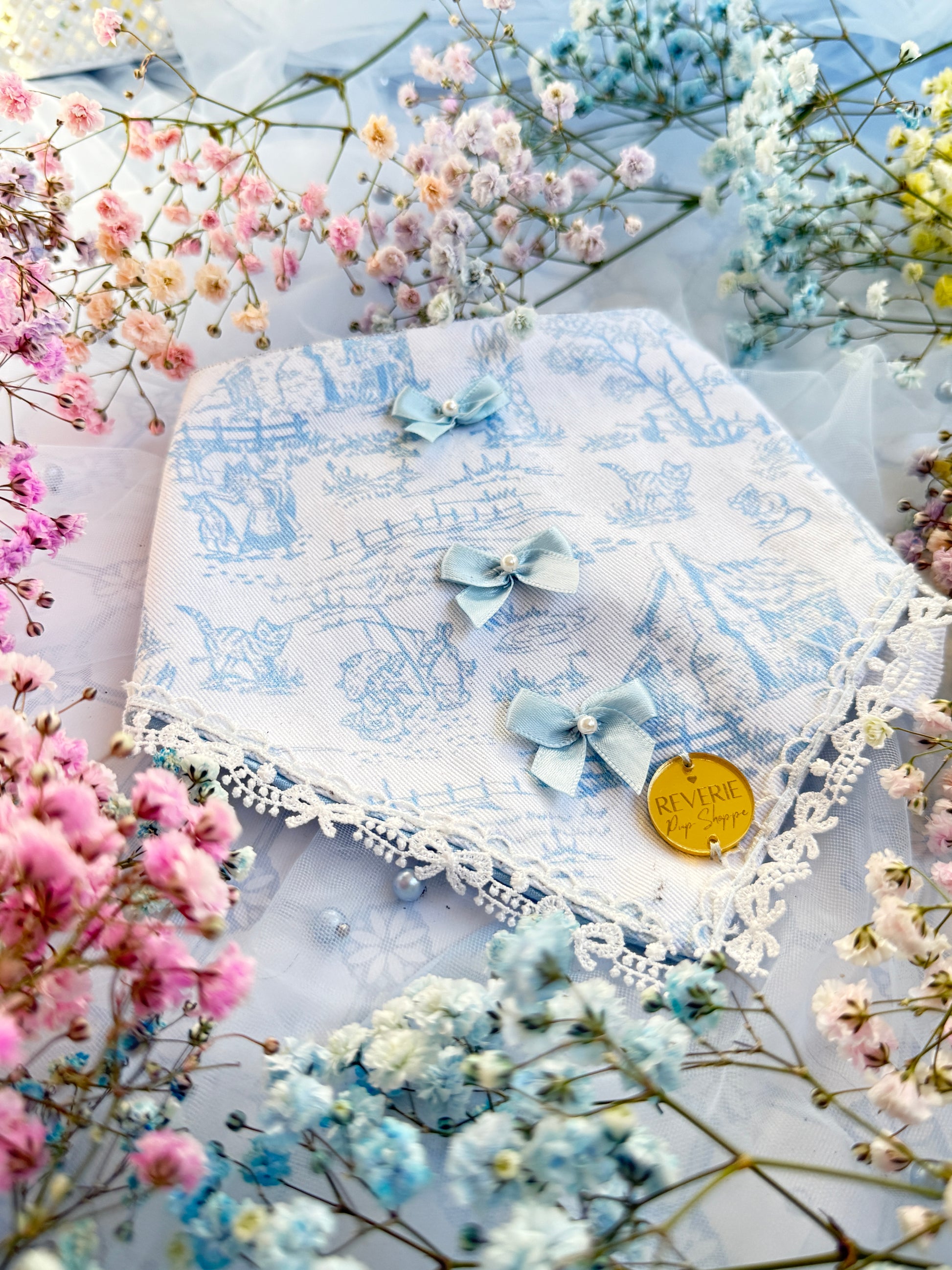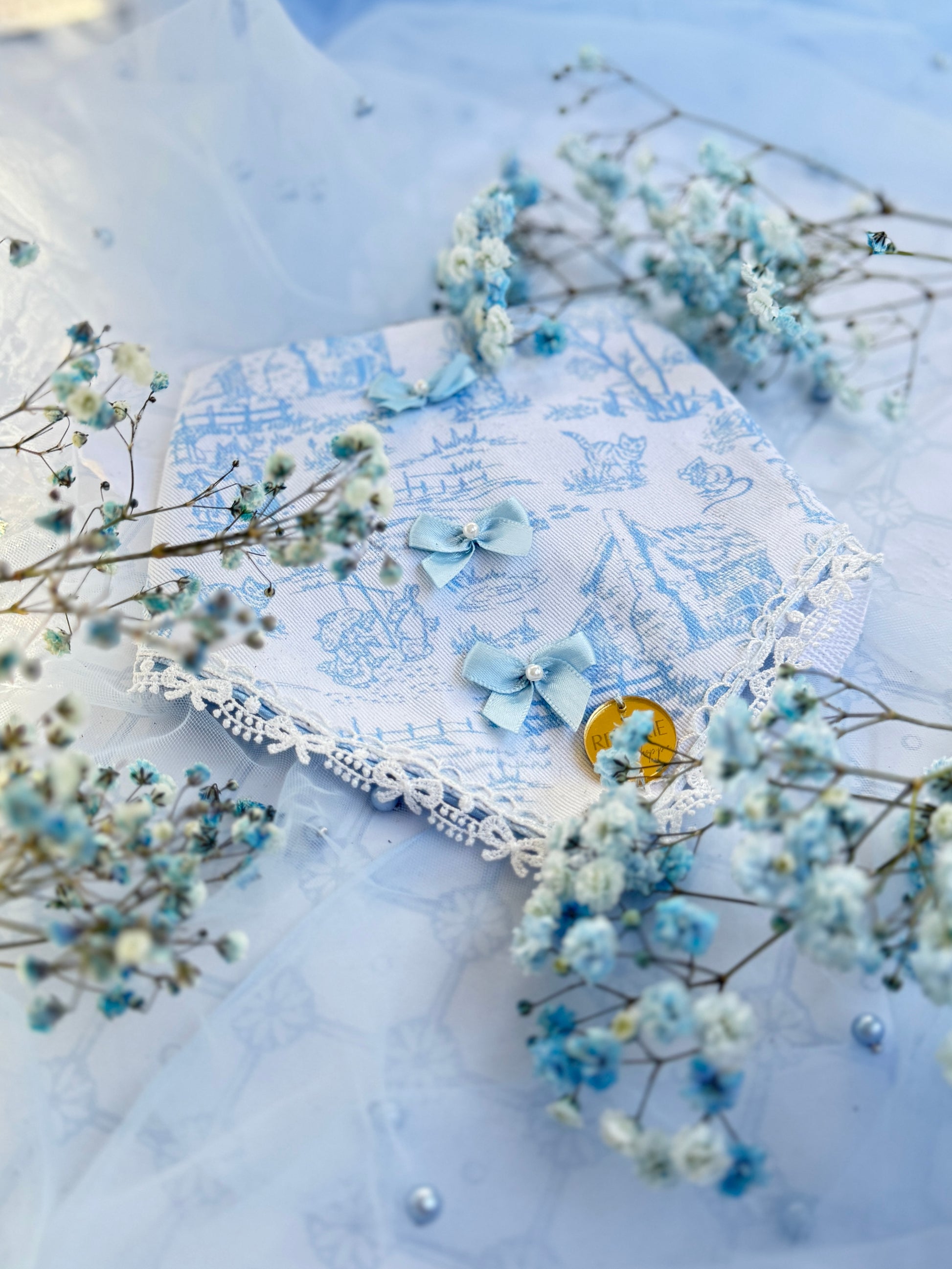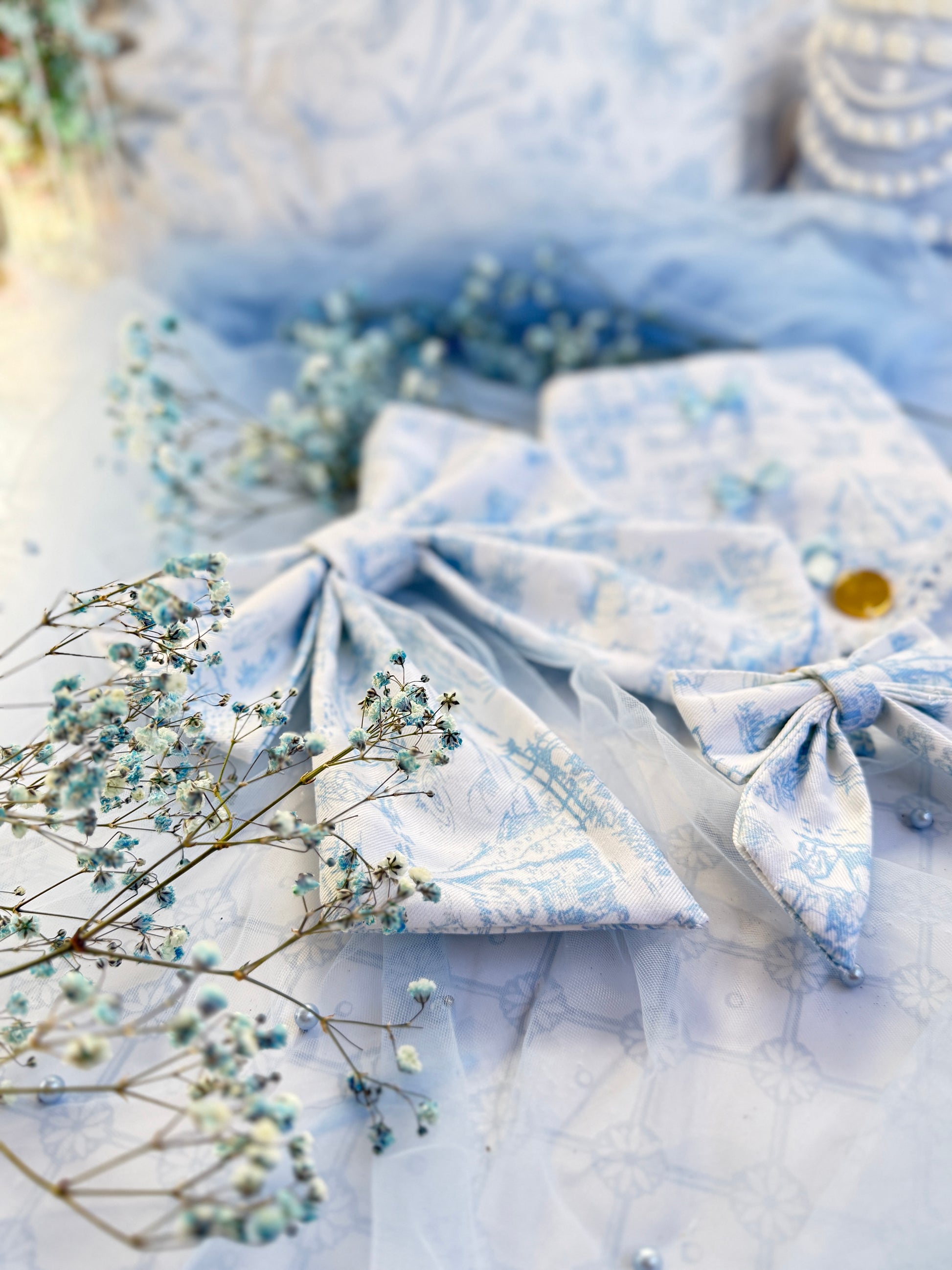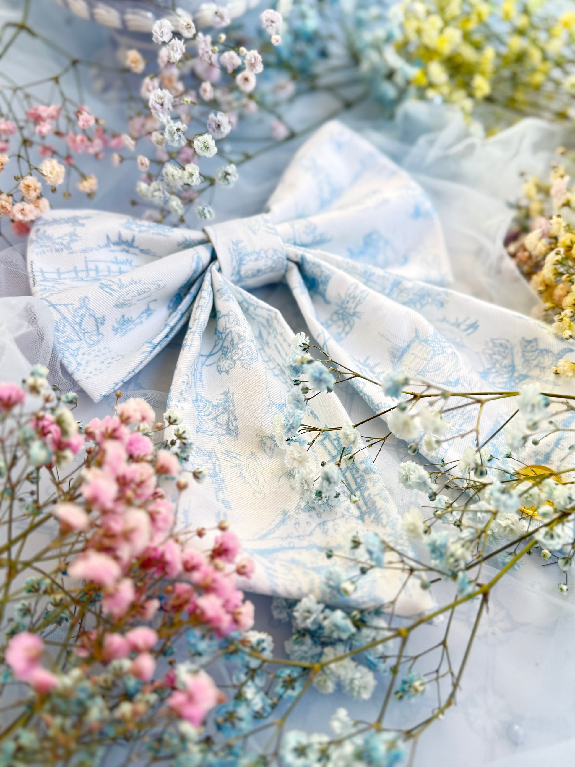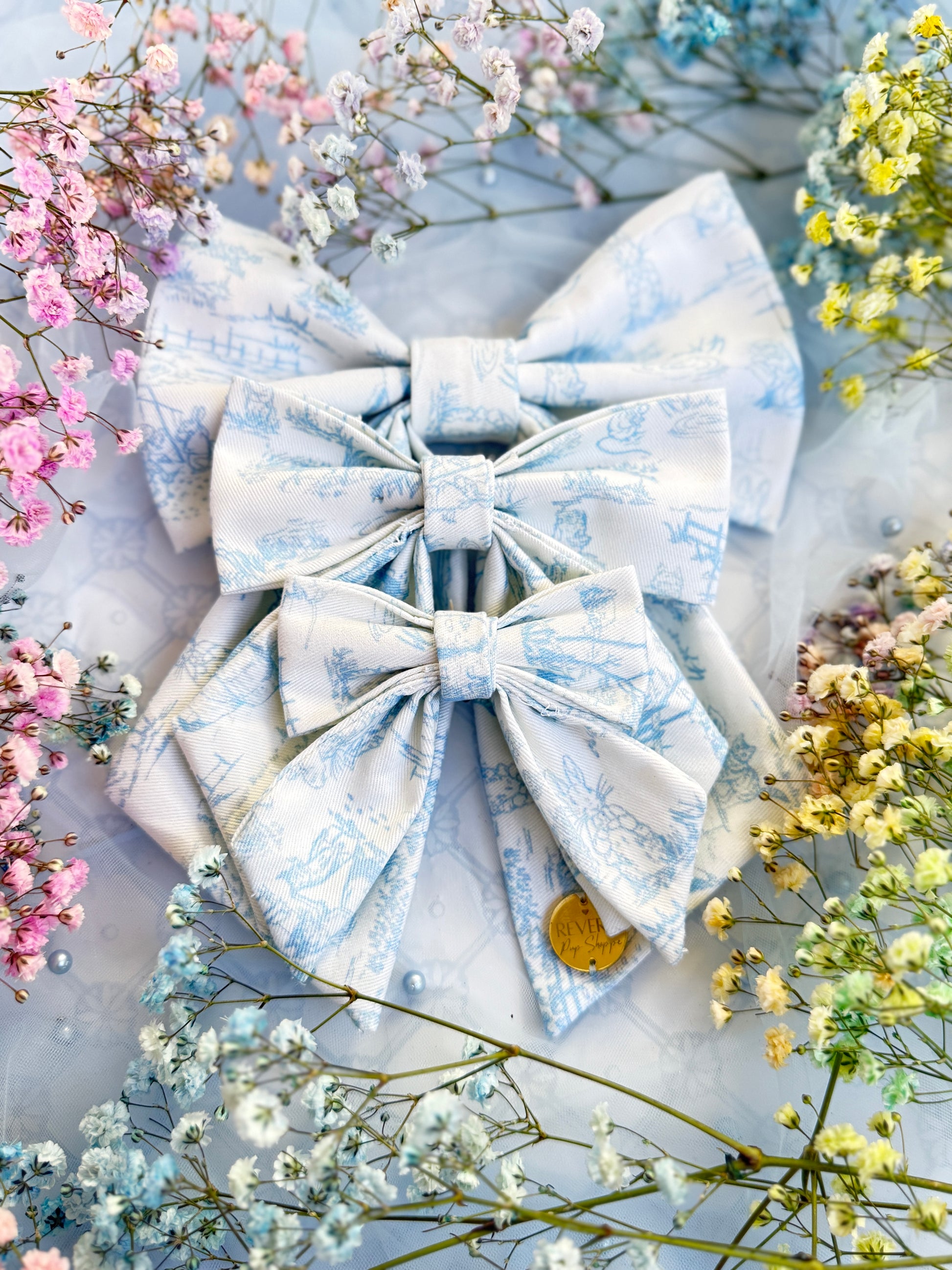 A soft blue toile bow adorned with whimsical characters and scenes from the beloved Beatrix Potter books, Benjamin’s Blue Bell captures the timeless charm of English countryside springtime. The vintage-inspired design evokes a peaceful, storybook-like quality, with its delicate illustrations and classic, cottage-style feel. This bow embodies the dainty beauty of nature, perfect for those who appreciate the quiet elegance of a simpler, more refined lifestyle.