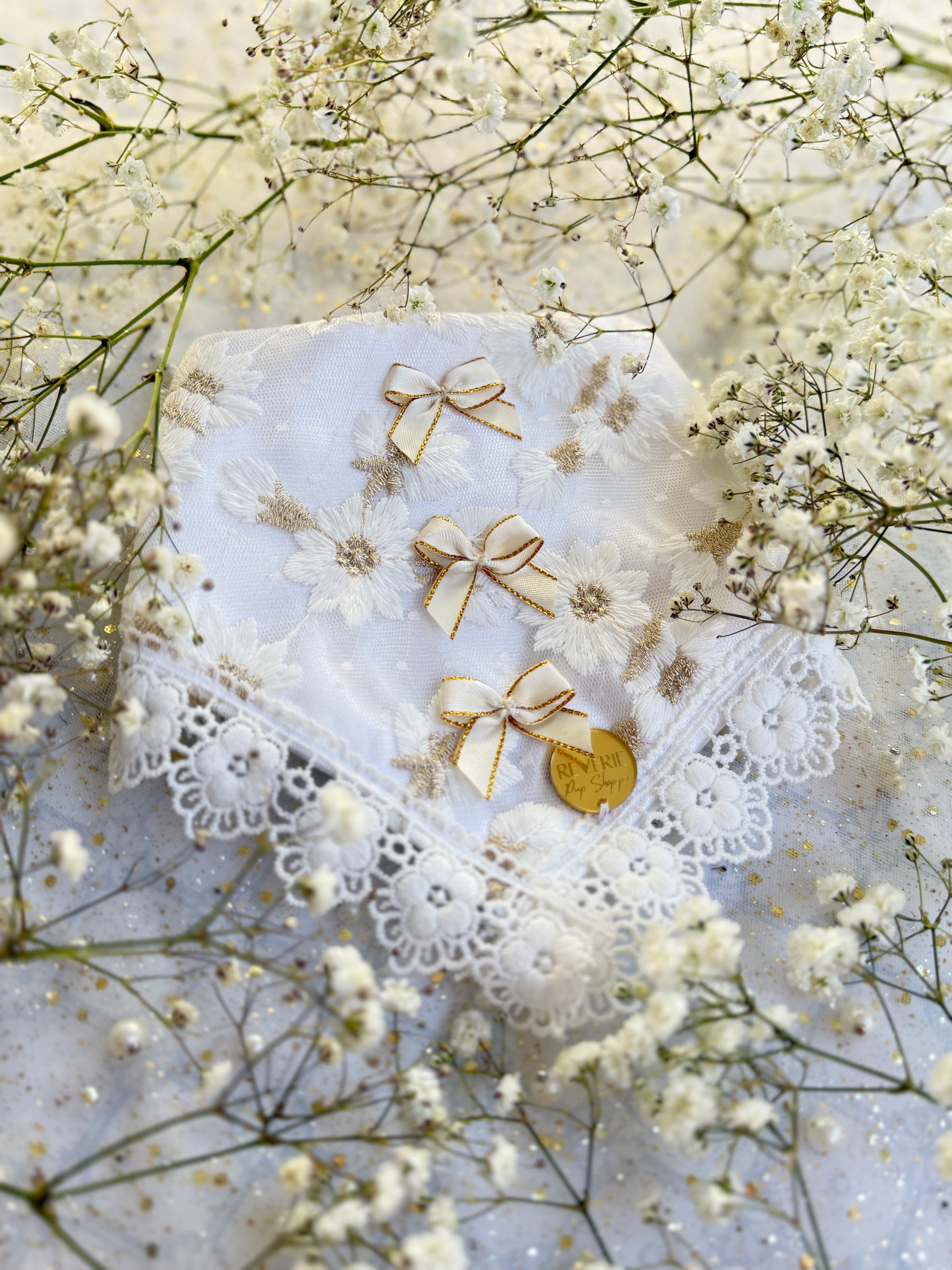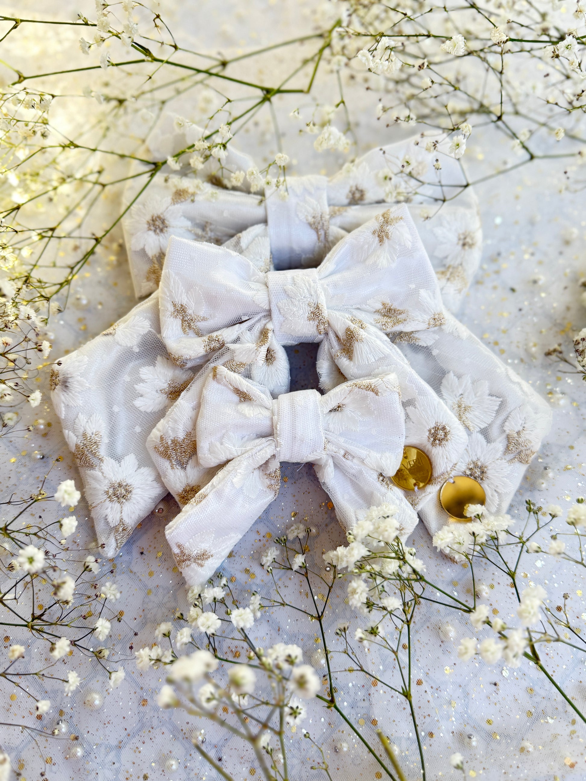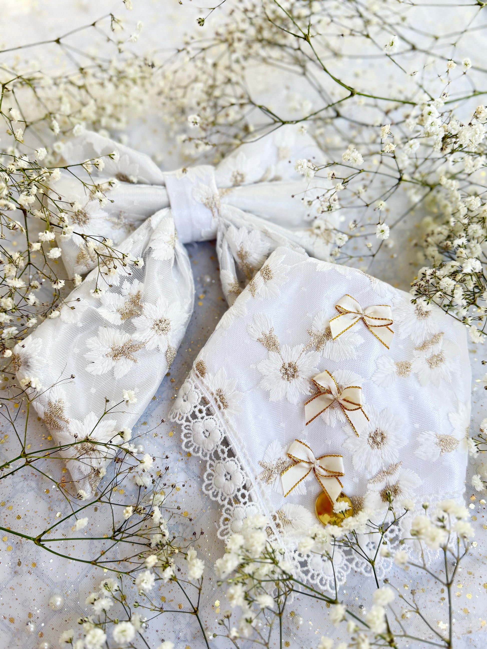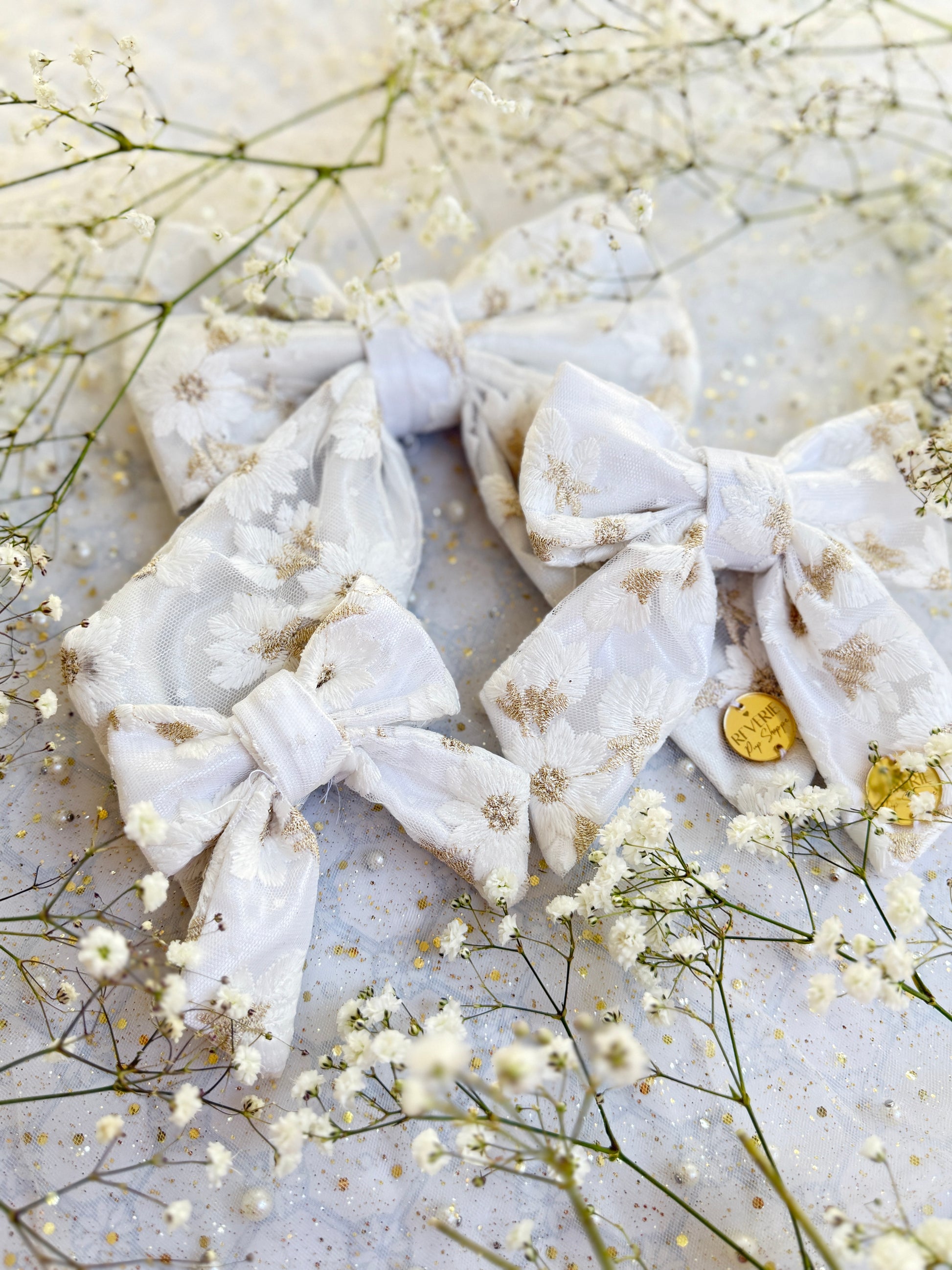 A delicate white daisy tulle over white charmeuse, Cottontail’s Chrysanthemum exudes a soft, serene beauty that is both understated and striking. The design reflects the simplicity of nature’s purest blooms, paired with vintage-inspired elegance that evokes the timeless charm of an English spring. With its delicate femininity and dainty appeal, this bow is perfect for those who appreciate classic, cottage-inspired style and demure beauty.