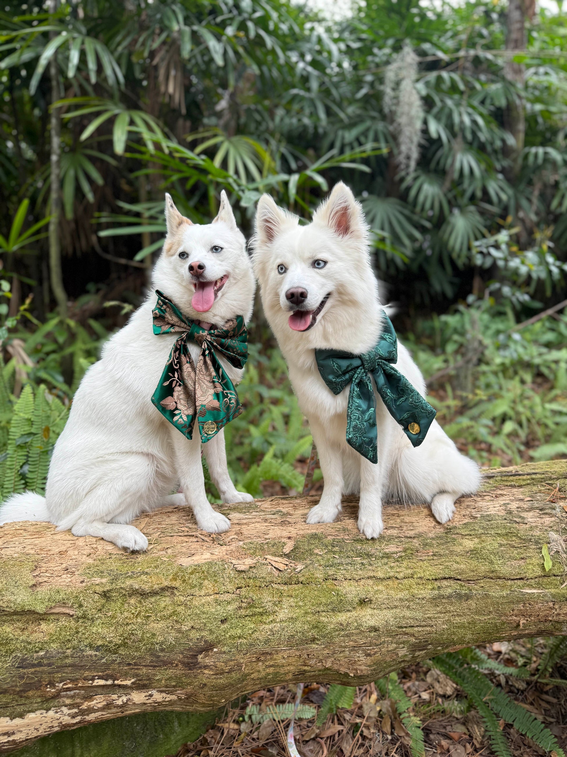 Enchantingly lush, Ivy embodies the untamed beauty of an ancient forest steeped in myth. Deep emerald satin is veiled in intricate, trailing embroidery, reminiscent of ivy vines weaving through forgotten castle ruins. This bow carries an air of old-world mystique, a talisman of natureโs quiet magic