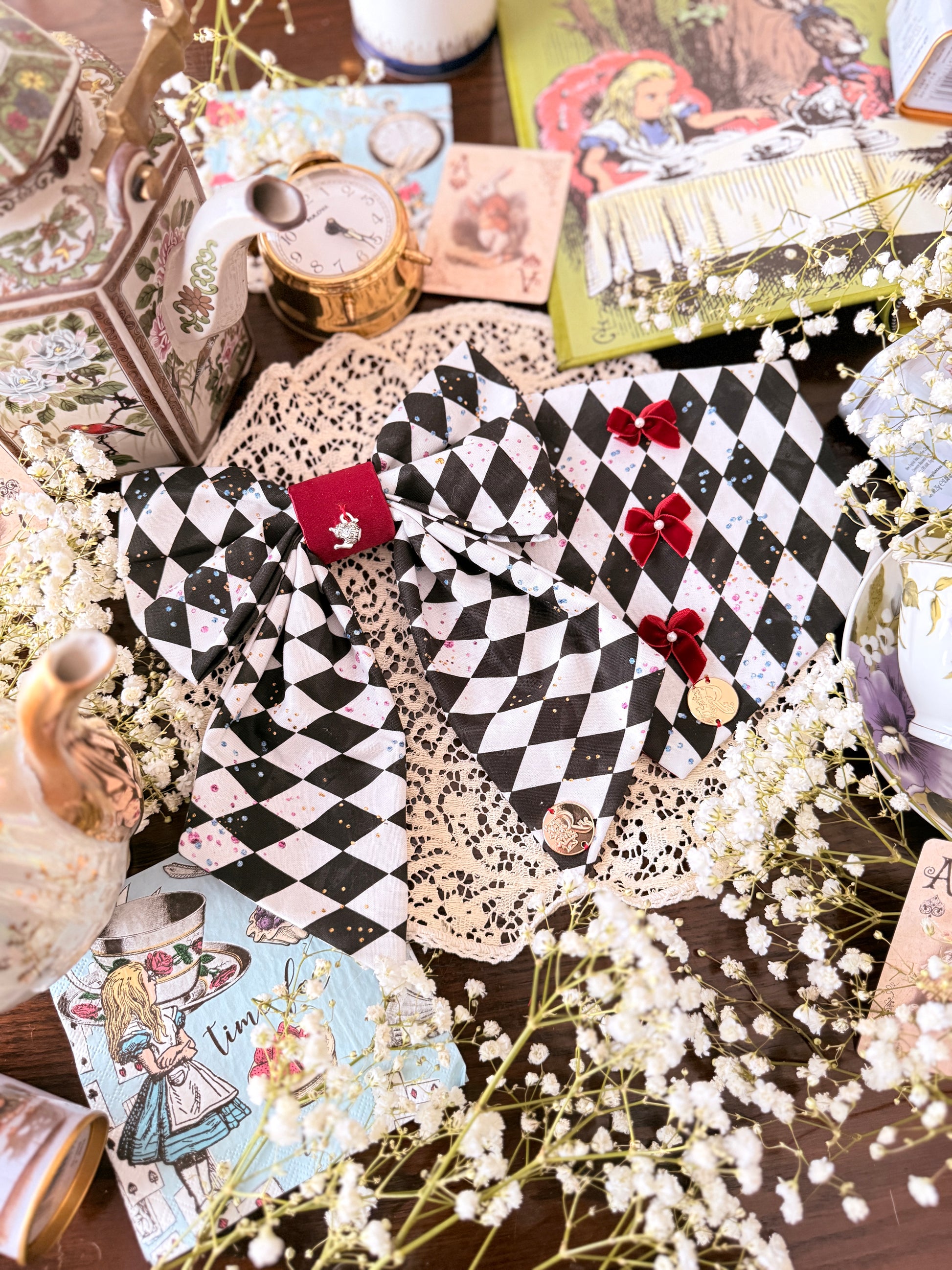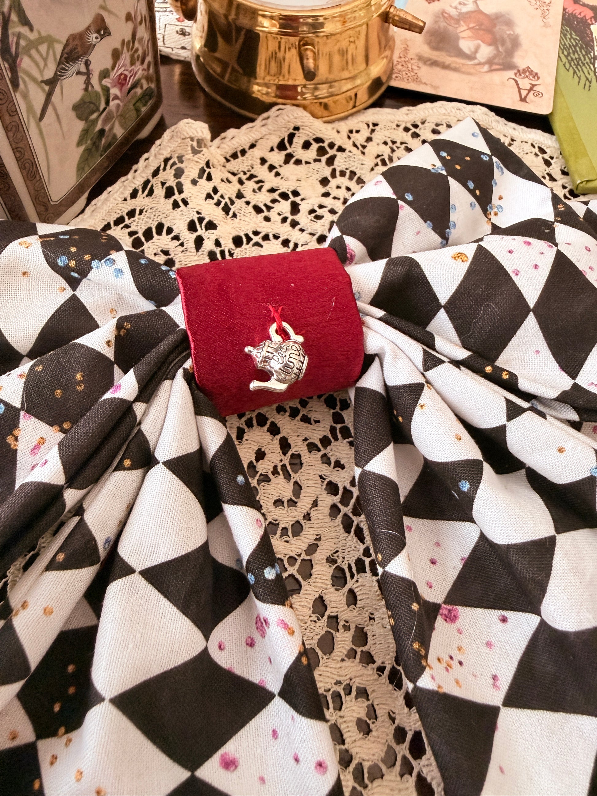 Black and white harlequin fabric becomes Wonderland’s tea party in motion, scattered with playful sparkles and anchored by a crimson charmeuse center. An antique silver teapot charm completes this nod to delightful nonsense and endless celebration.