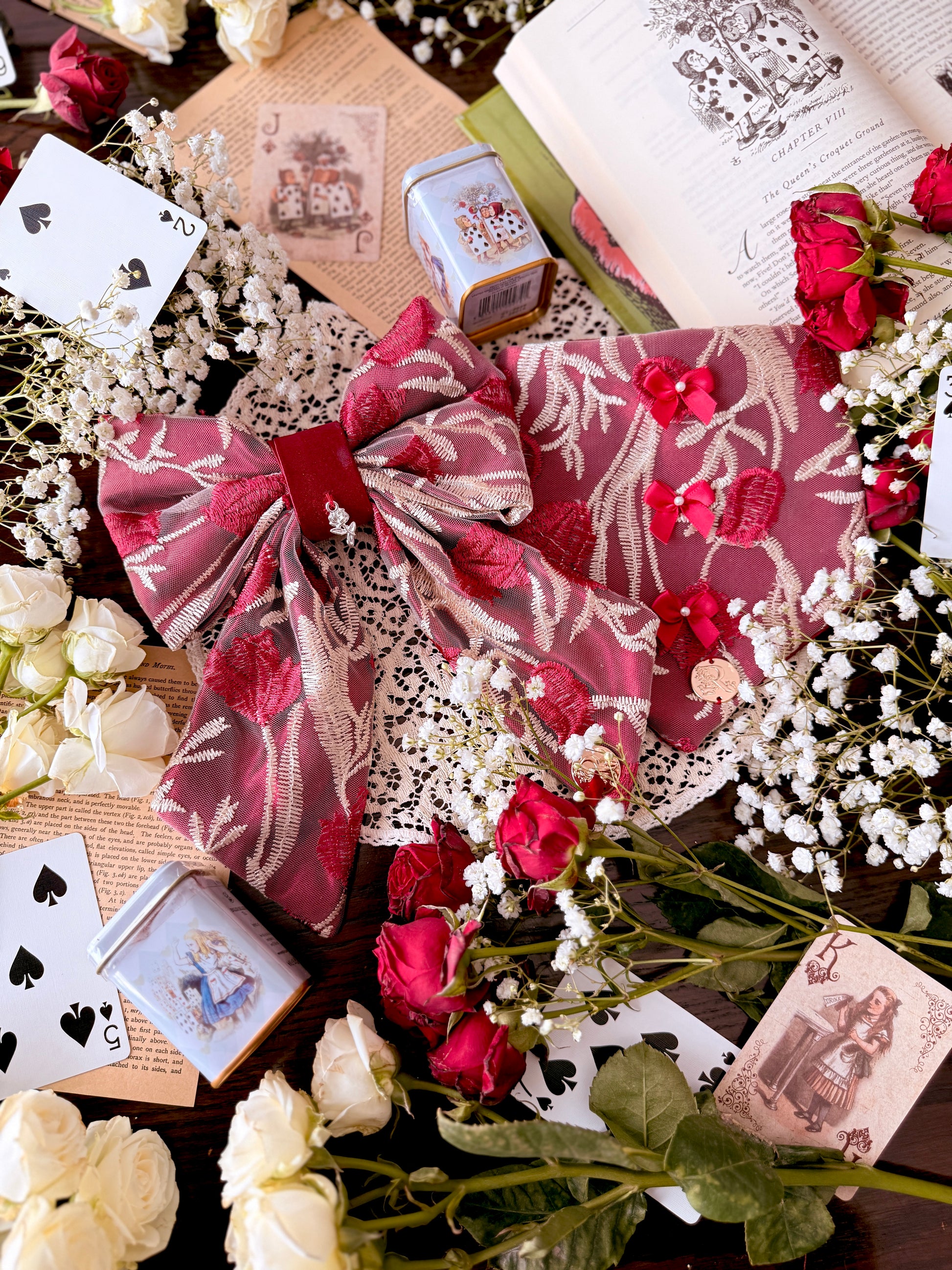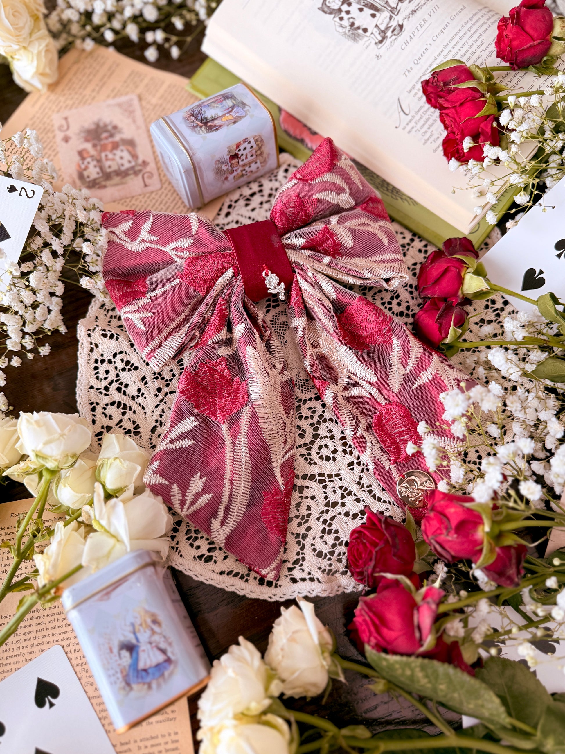 My personal favorite of the collection. Off-white and crimson embroidered mesh floats over rich crimson charmeuse, finished with a charmeuse center and an antique silver rose charm. Romantic, dramatic, and unmistakably Wonderland.