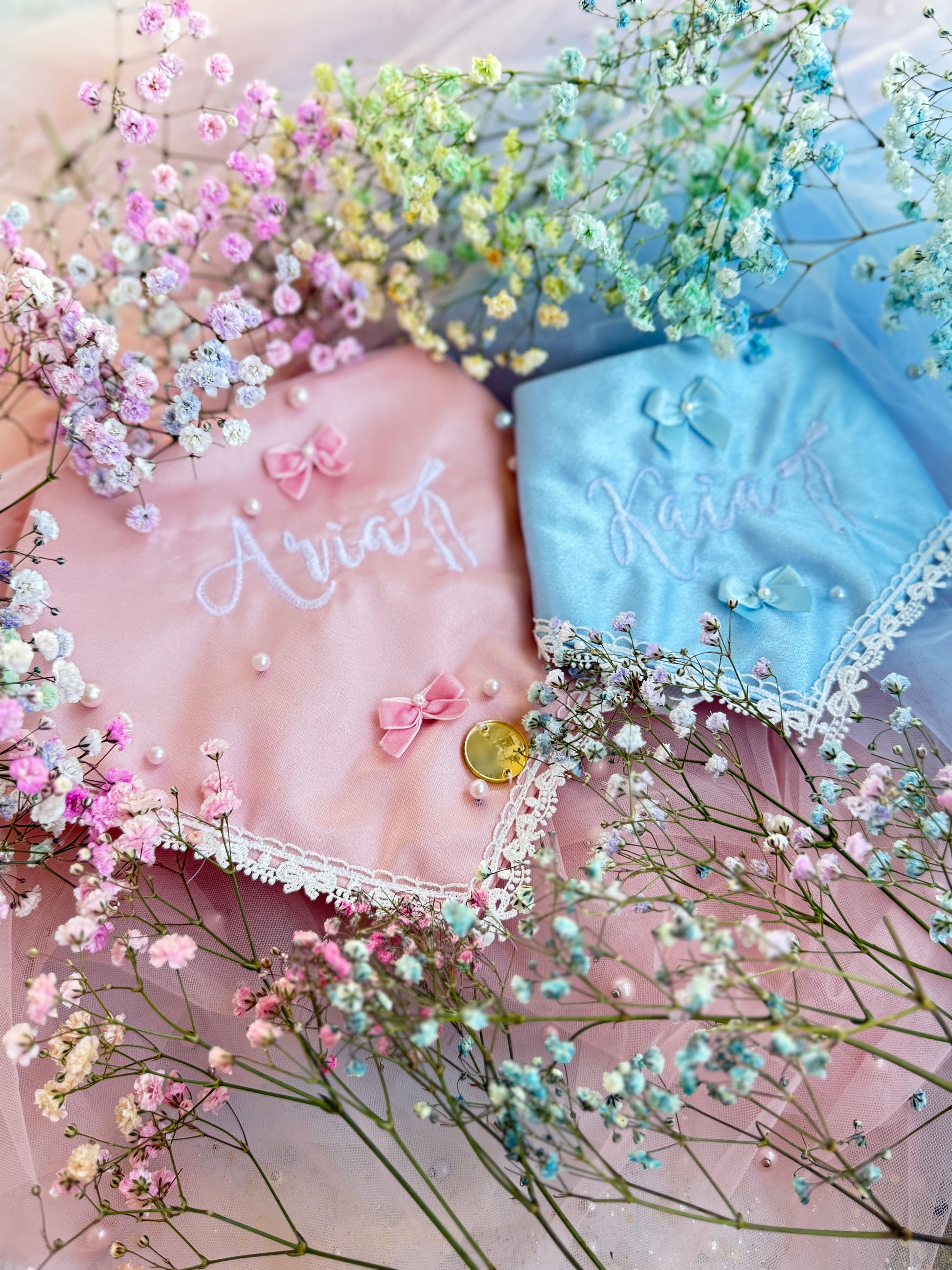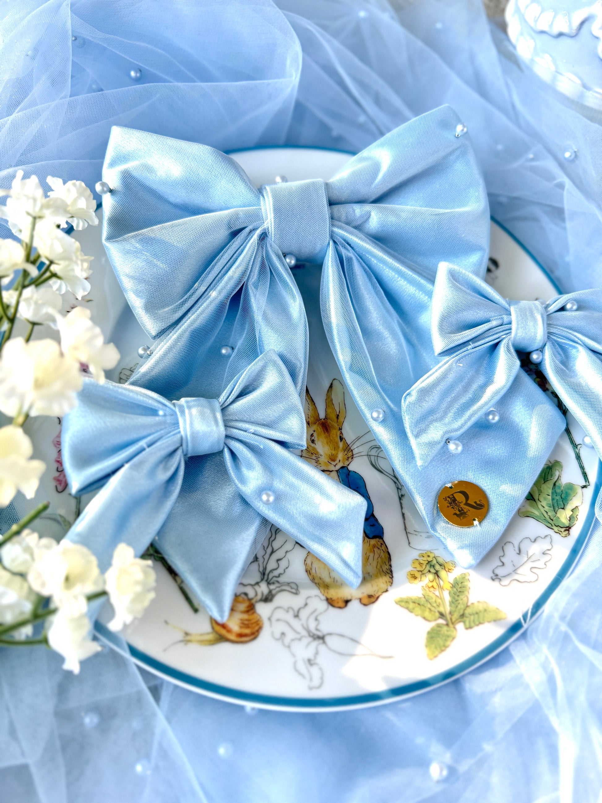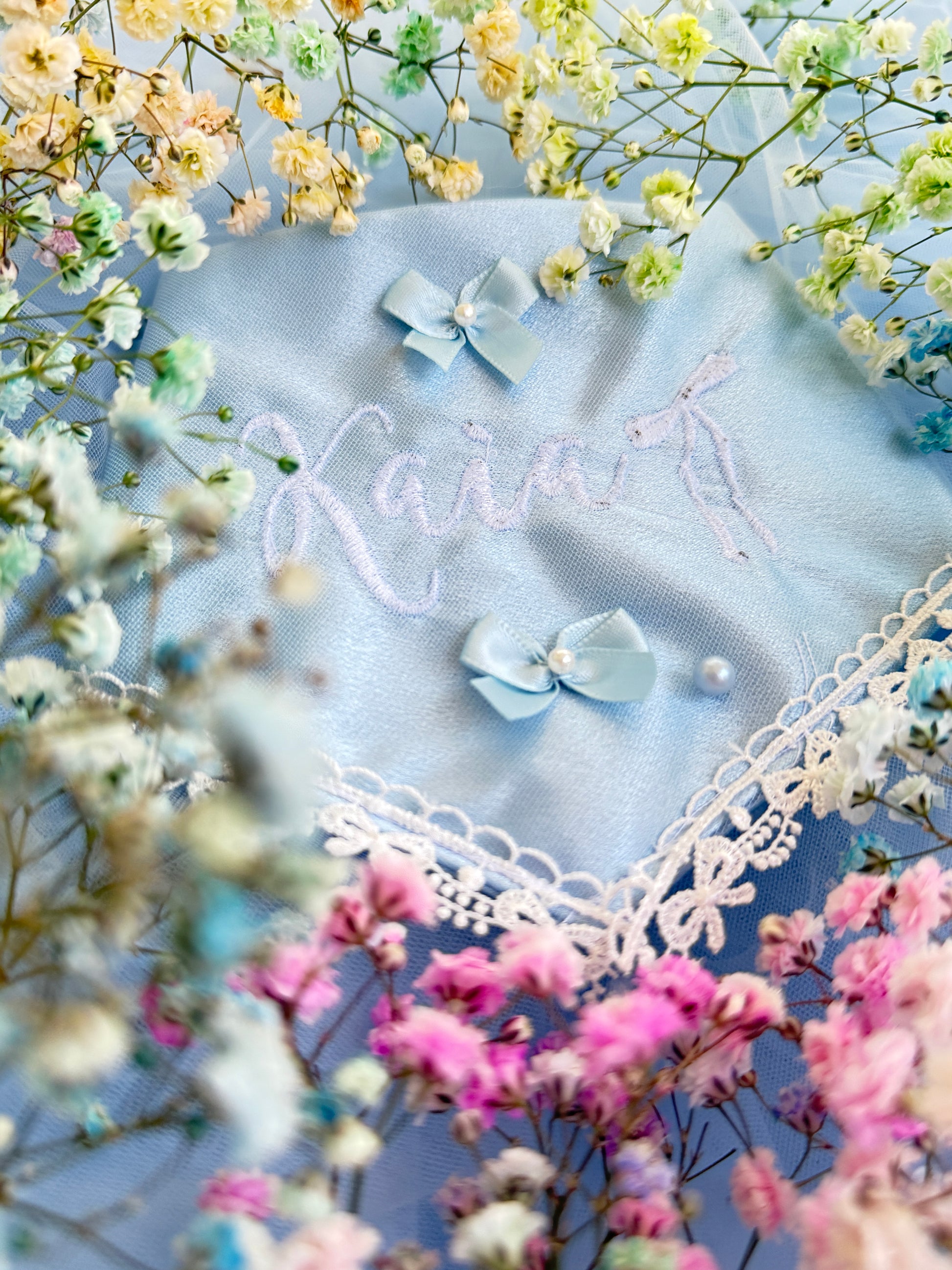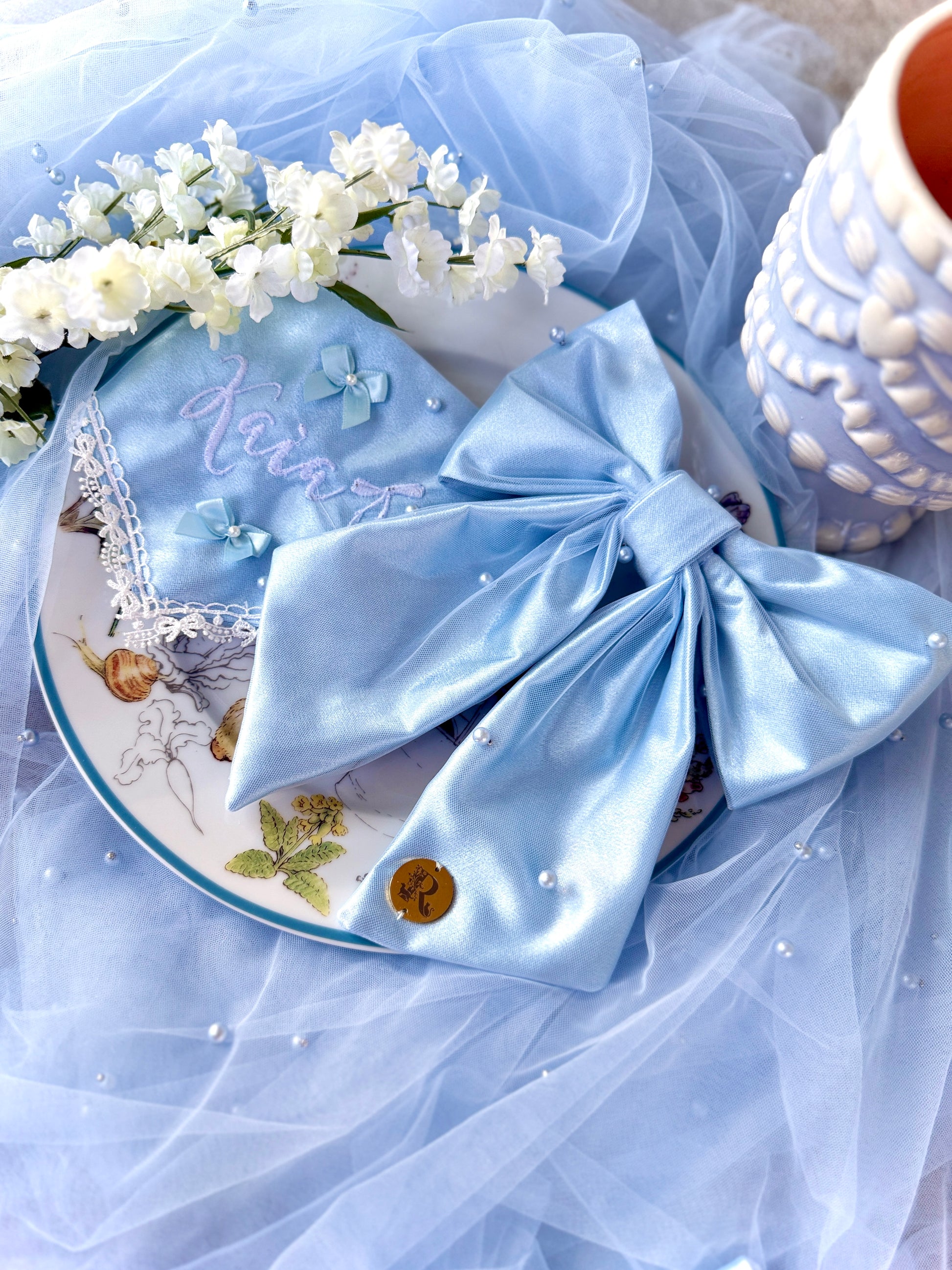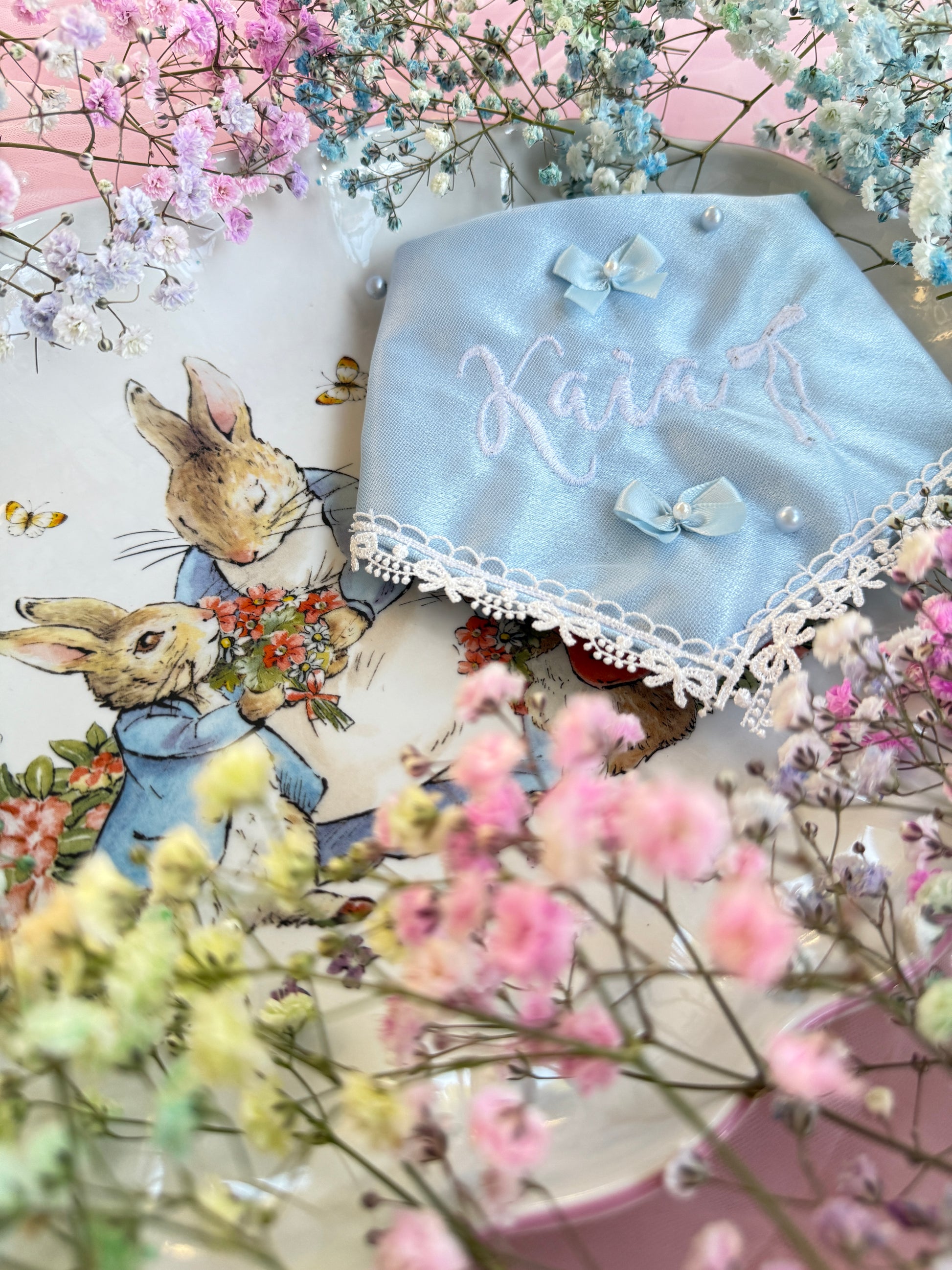 A soft blue pearl mesh bow that captures the delicate beauty of springtime in the English countryside. The ethereal blue tones and intricate detailing create a vintage, feminine charm, evoking the romance of a blooming garden. What makes Peter’s Peony truly special is its custom embroidery option, allowing you to personalize it with your pet’s name for a one-of-a-kind, heirloom-inspired touch. This bow is perfect for those who adore timeless elegance and bespoke details.