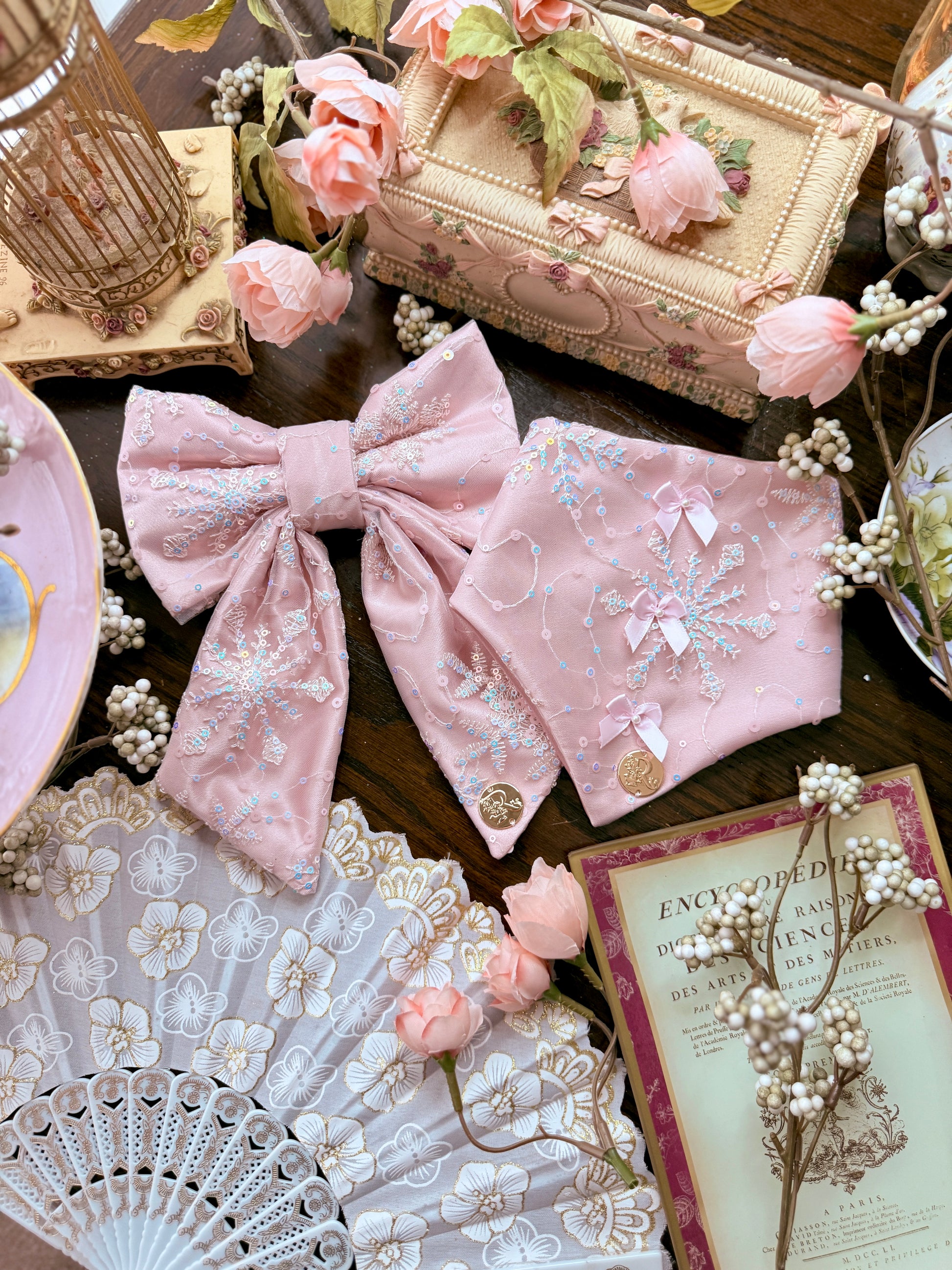 Whimsical and romantic, The Kate feels like a winter fairytale told in soft pinks and shimmering embroidery. Delicate snowflake motifs are stitched throughout sheer blush fabric, accented with subtle blue details that give the design depth and dimension. The bow feels light and dreamy, while the coordinating bandana is finished matching satin bows with pearls.
