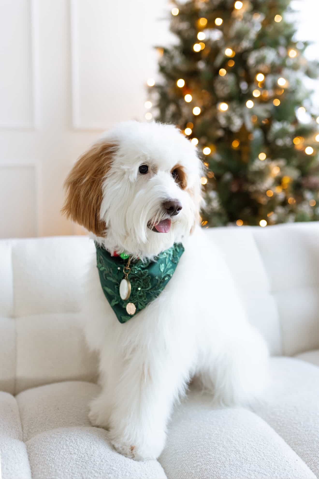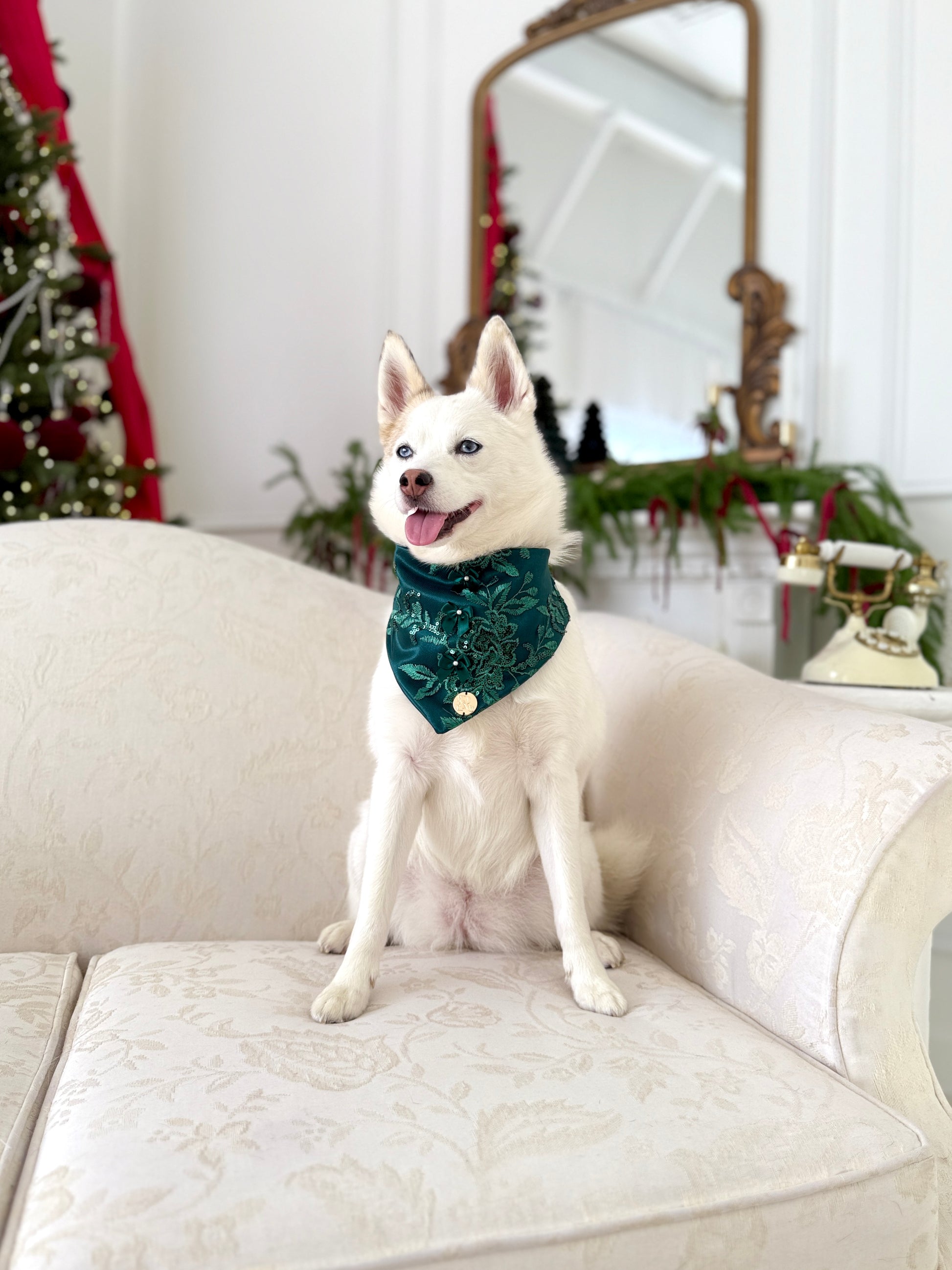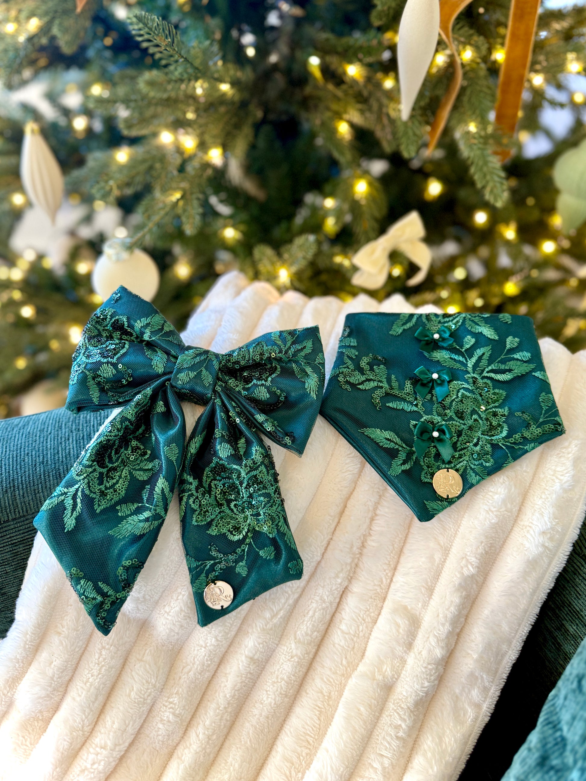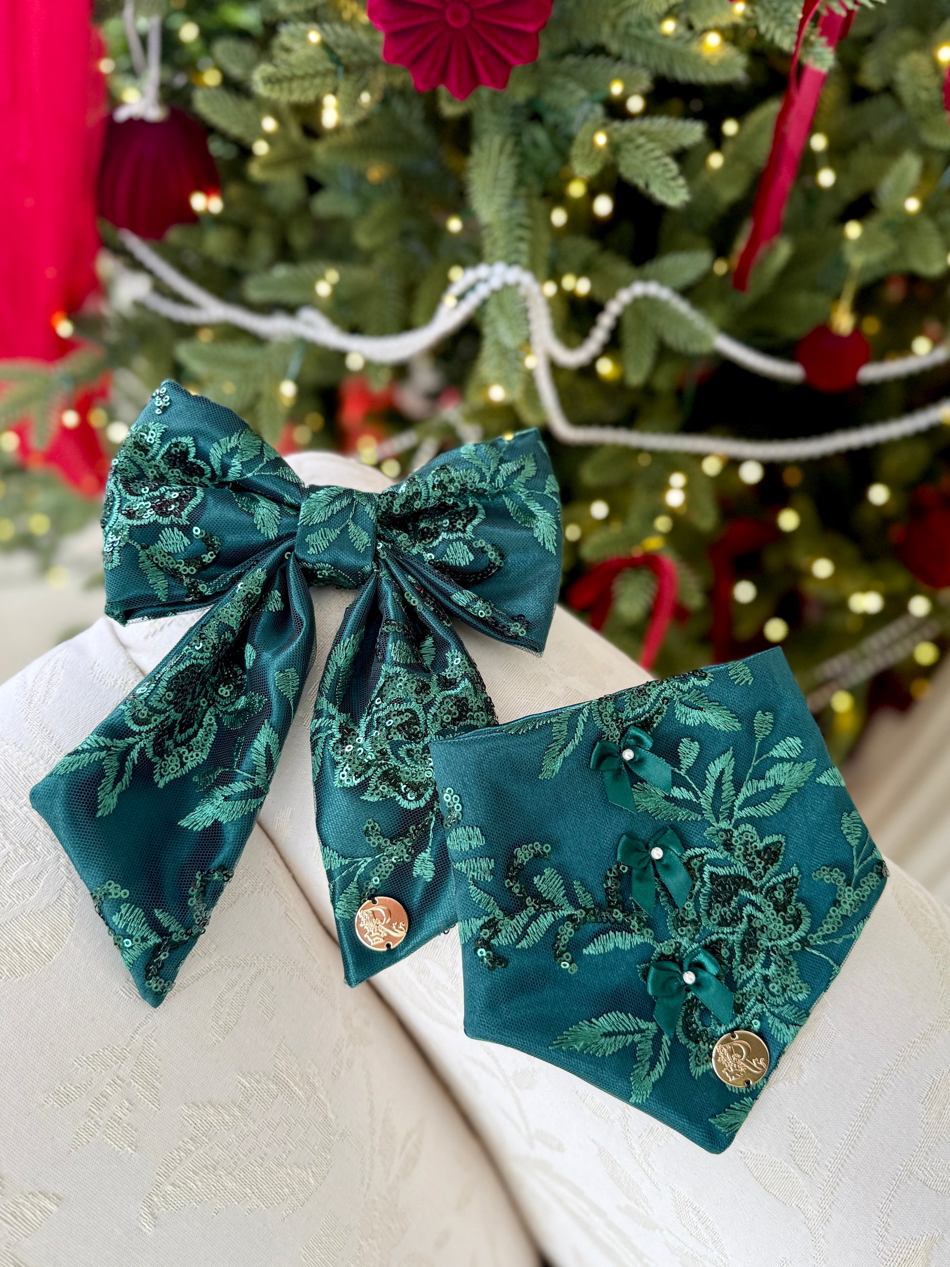 The Evangeline bow is crafted from deep evergreen velvet and finished with a green and gold charm. It can also be personalized with a delicate embroidered initial for a meaningful, heirloom touch.