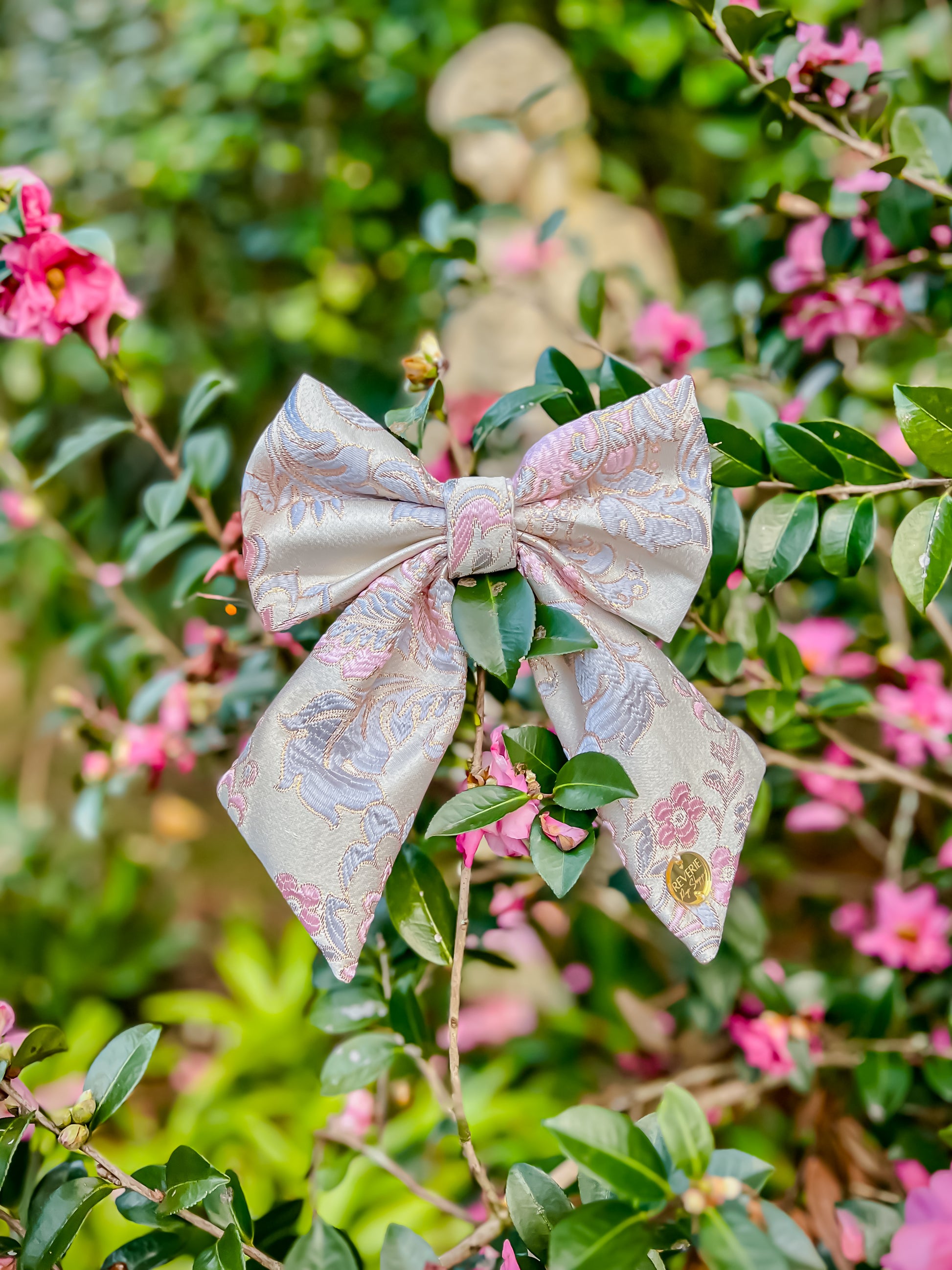 Introducing Ophelia - a luxurious blend of sophisticated white brocade, opulent florals, and vibrant shades of pink and cornflower blue. Experience the beauty and elegance of this exquisite product, crafted with the utmost attention to detail. Let the vibrant colors and delicate patterns inspire you to embrace the finer things in life. Treat yourself to the opulence of Ophelia.