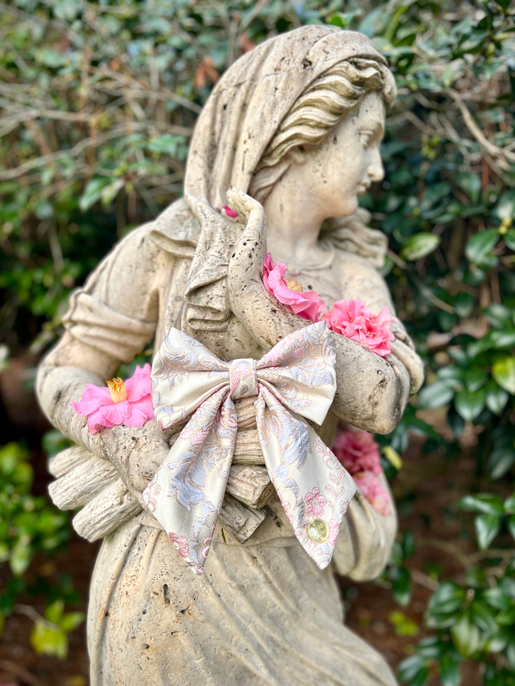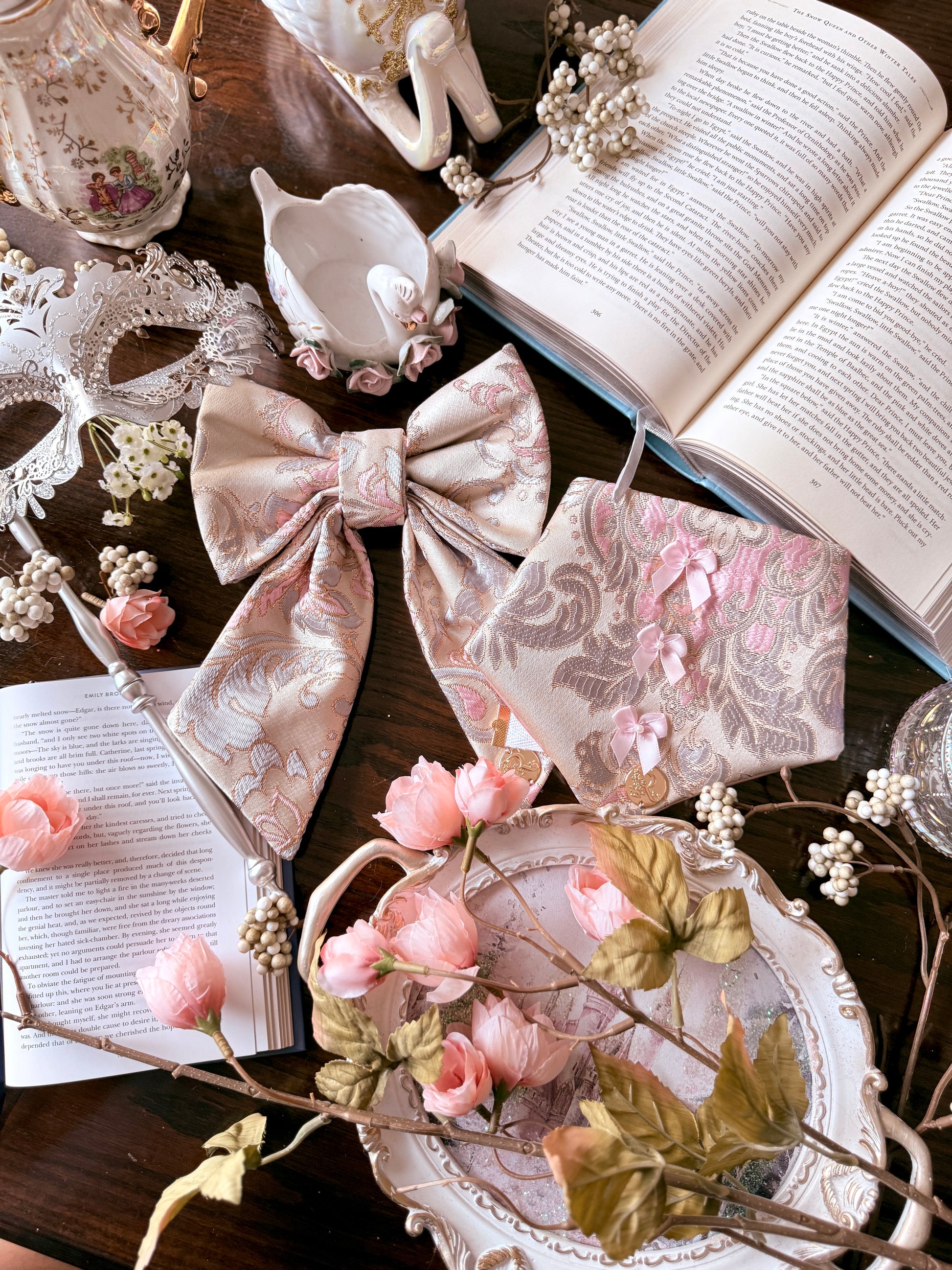 A beloved Reverie favorite and one of my personal favorites, Ophelia returns from last Valentine’s Day by special request. This elegant bow features blush and dusty blue brocade woven into a soft cream base.