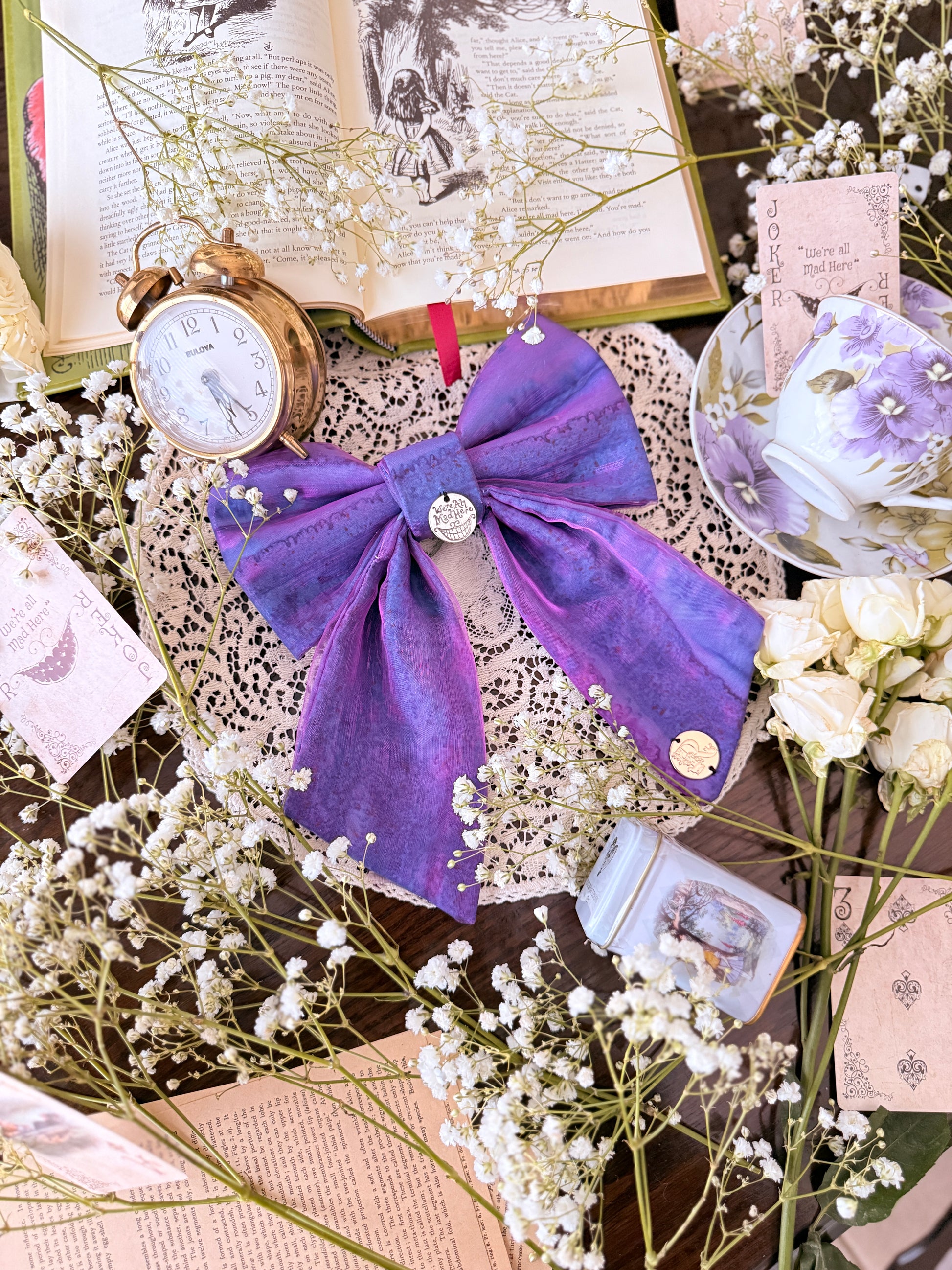Inspired by the Cheshire Cat, this bow layers two-tone purple, blue, and magenta organza over dyed cotton, creating a dreamy, otherworldly glow. An etched Cheshire smile charm adds a mischievous wink. Offered as a signature bow, mini bow, and bow tie only.