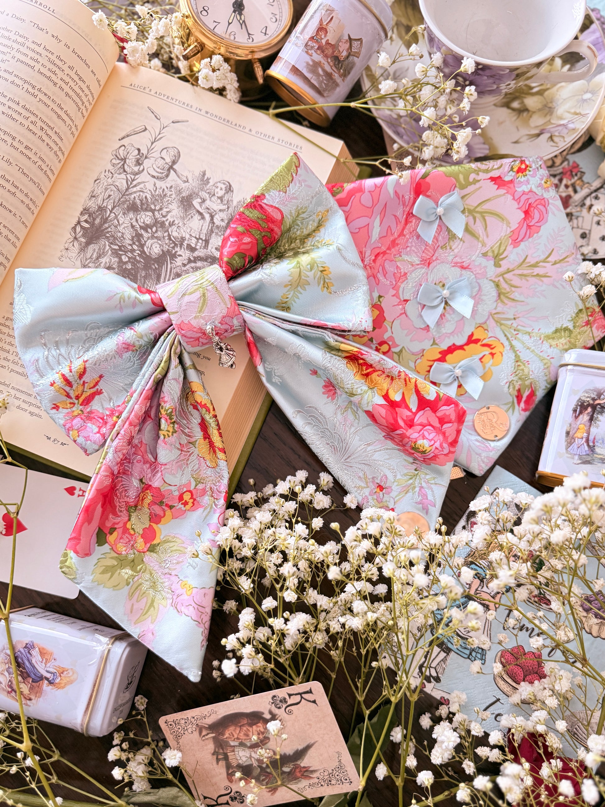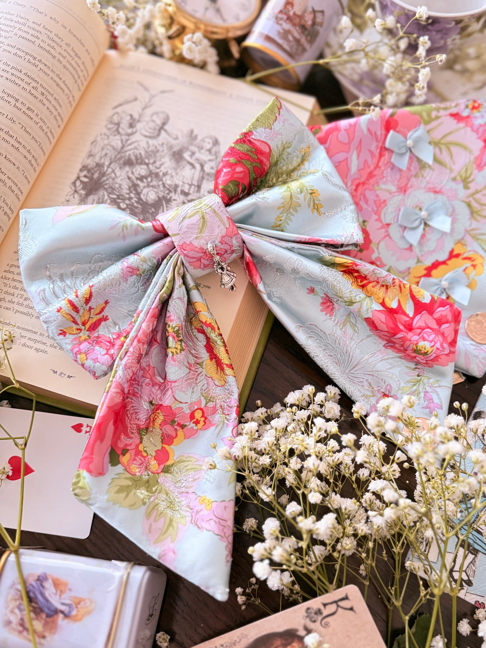 Sky blue jacquard brocade shimmers with embossed silver blossoms, evoking Alice’s quiet wander through the living garden. Finished with an antique silver Alice charm, this piece feels like sunlight on petals, gentle, enchanted, and softly storybook.